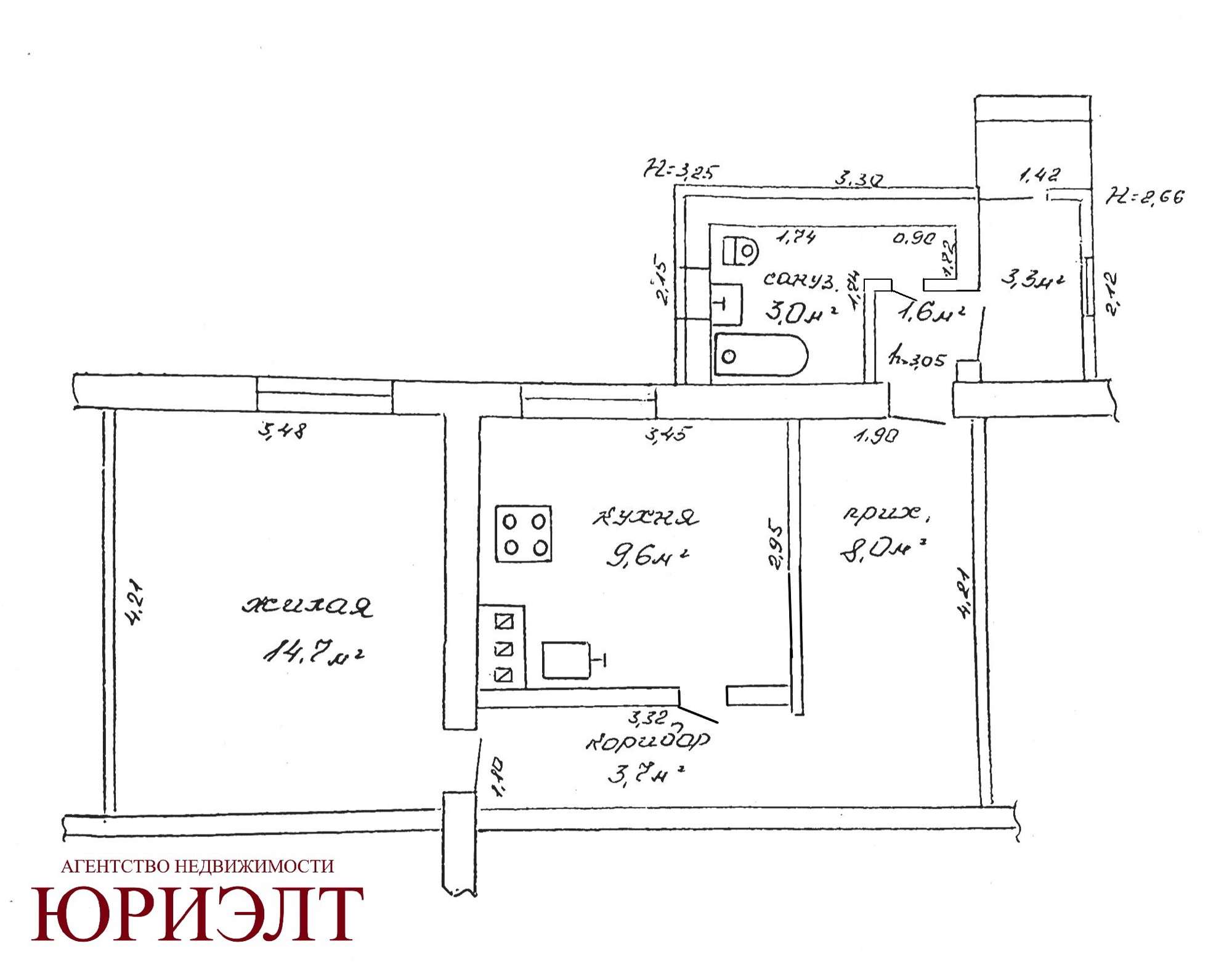 Общая площадь по СНБ - 43,8 м², общая жилая - 40.5 м², жилая - 14.7 м², кухня - 9,6 м², с/у - совмещен.