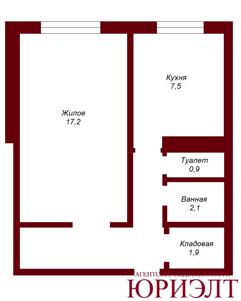 Общая площадь квартиры - 37,5 м2, где жилая комната площадью 17,2 м2, кухня - 7,5 м2, раздельный санузел, просторный коридор и кладовая.