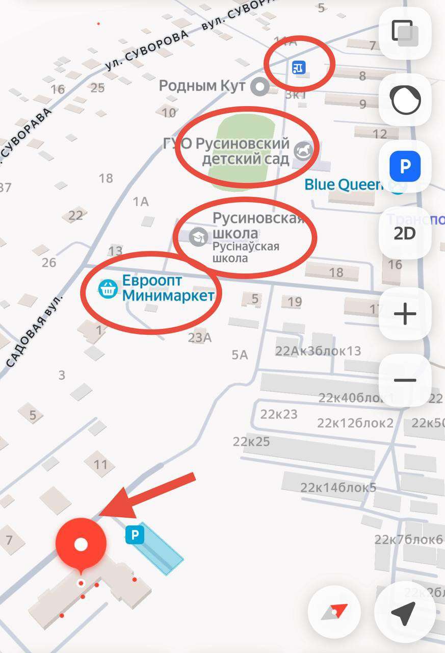 * В шаговой доступности продовольственный магазин ЕВРООПТ, почта, школа, детский сад, ЖД станция РУСИНО, автобусная остановка.