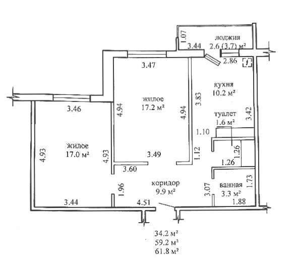 Квартира хорошей планировки. Общая площадь по СНБ – 61.8 м², общая жилая- 59.2 м², жилая – 34,2 м², кухня – 10,2 м².