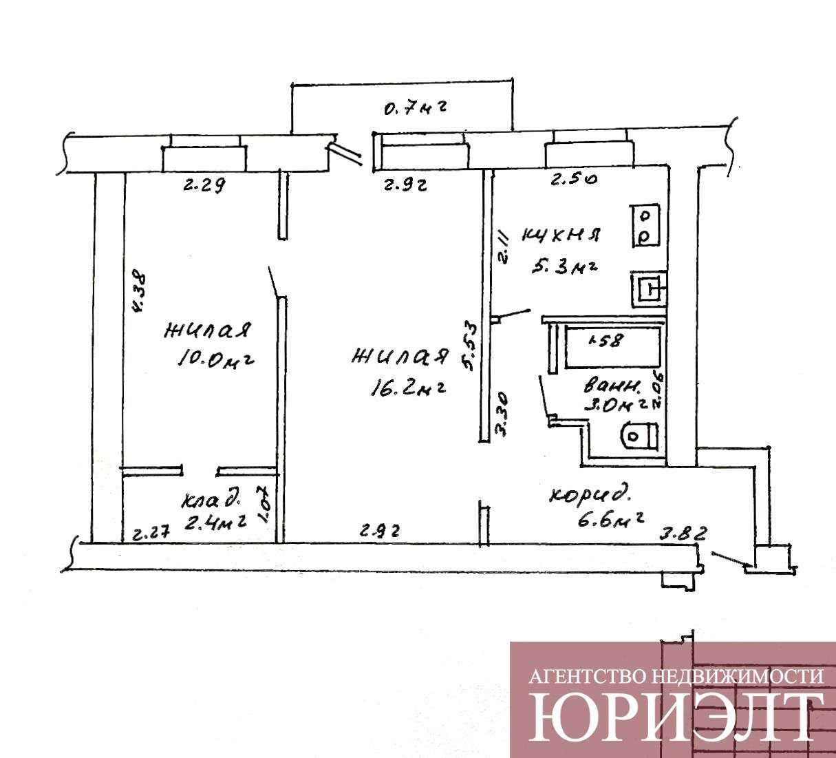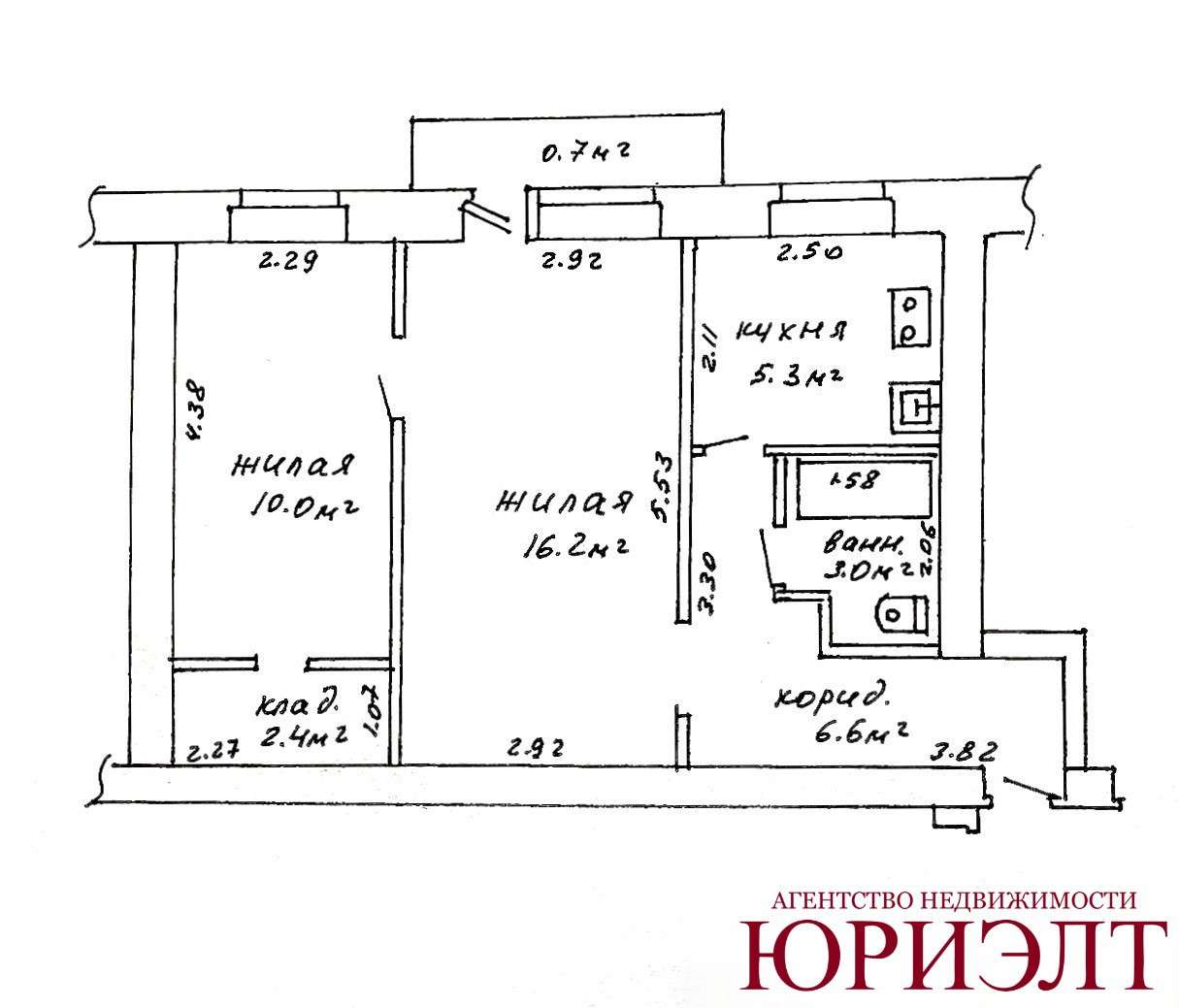 Общая площадь по СНБ – 44,2 м², жилая – 26,2 м², кухня – 5,3 м².