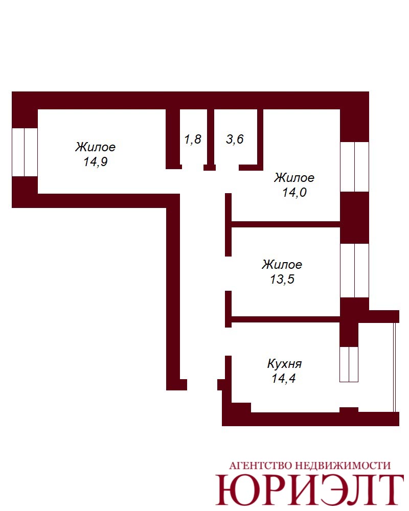 Квартира имеет удобную планировку: большая кухня – 14,2 м², три жилые комнаты с площадью 14,5 м², 14,1 м² и 13,4 м² с окнами, выходящими на две стороны дома, большой коридор, раздельный санузел, застекленная лоджии с выходом из кухни.
