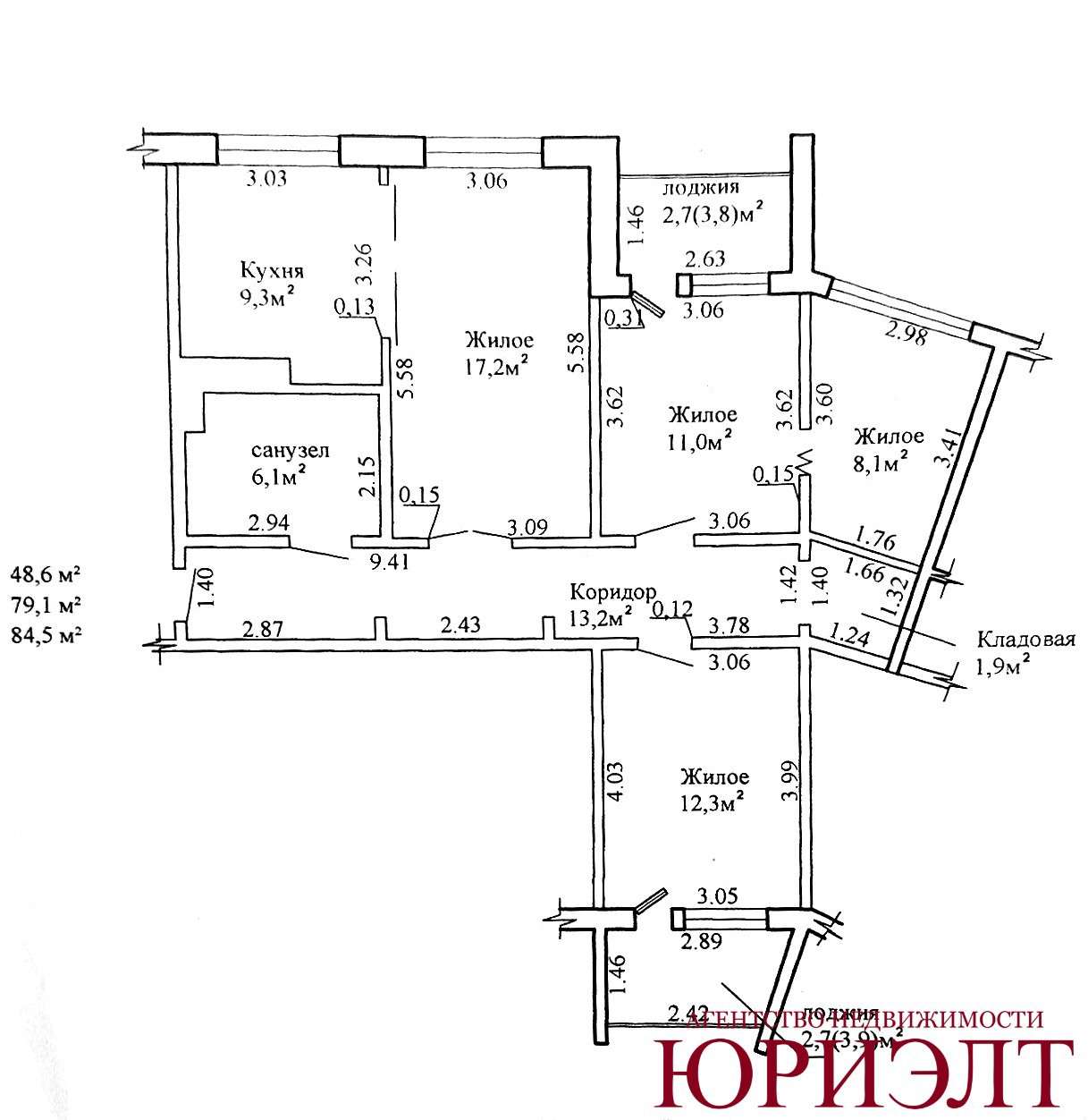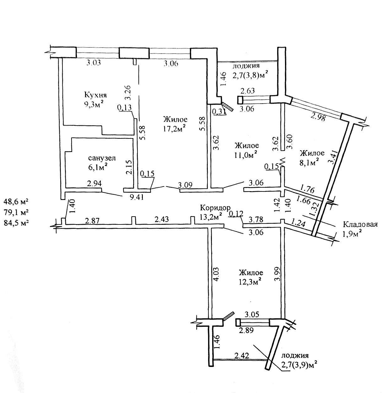 Общая площадь по СНБ – 84,5 м², жилая – 48,6 м², кухня – 9,3 м².